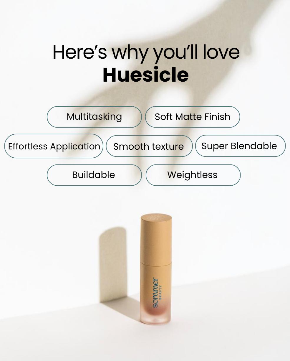 Huesicle is a versatile, buildable multitasking pigment made for your lips, cheeks, and eyes. It’s your one-and-done solution for an easy, effortless pop of colour.
